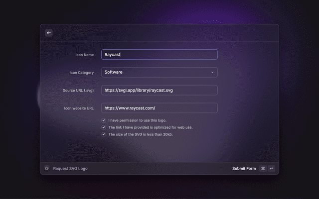 You can use the Request SVG Logo command, enter the required information in the form, and it will automatically redirect you to the svgl repository issue page, where the template will be pre-filled for you.