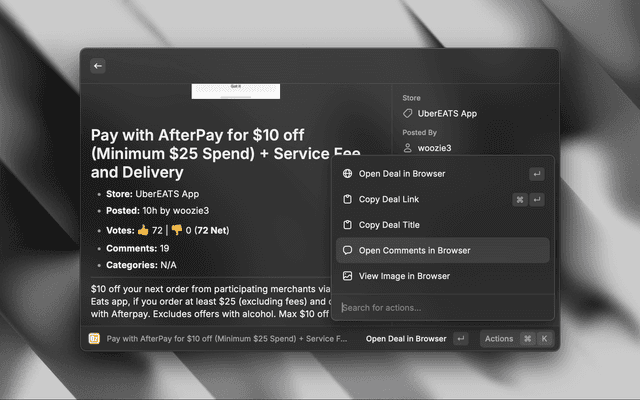 Your lightning-fast portal to the latest and hottest deals from OzBargain. Browse new bargains, check their popularity score, and jump straight to the deal or discussion without leaving your keyboard. Essential for savvy shoppers in Australia!