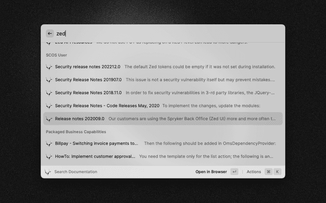 This extension will allow to easily go through the Spryker docs directly from Raycast. It will also allow searching within the documentation with algolia.