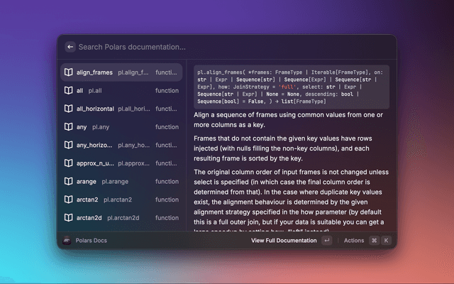 A Raycast extension that lets you search the Polars API reference and preview detailed documentation without leaving Raycast. Results include signatures, descriptions, parameters, and return values, with quick actions to open the official docs in your browser.