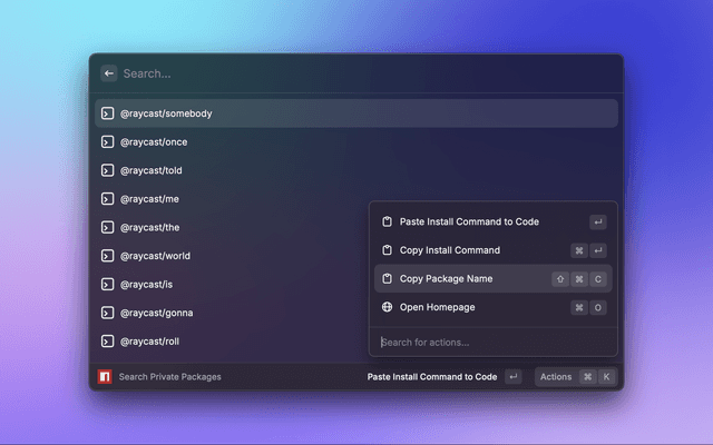 This is a simple tool to search for private npm packages in a given directory. It will search for the packages under a user or organization account. For example, if you have a private npm package under the @raycast organization, you can search for it using this tool.