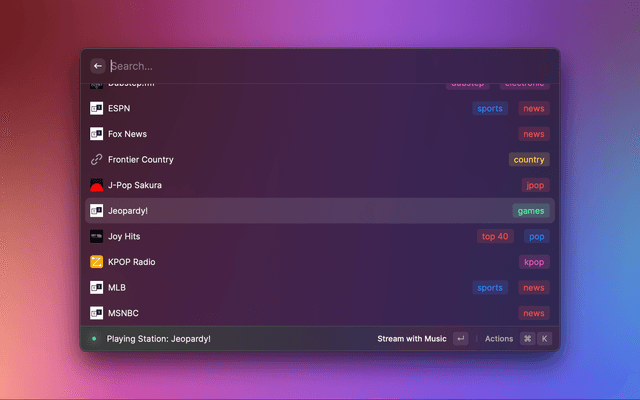 With the Search Stations command, you can find stations from all over the globe streaming almost any genre. The dataset that the extension pulls from can be found here. If you have a station not listed there, please considering adding it!