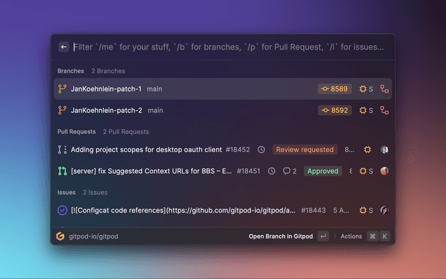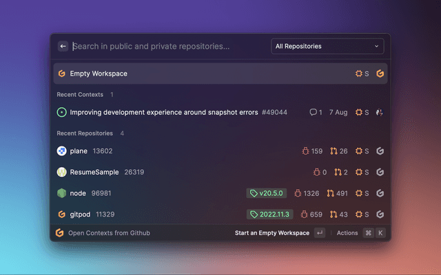 We pin every context that you open with Gitpod, for faster access and if you wish to manually add any context to your Recents/Pinned list, you can achieve by a single command cmd + R and bingo!