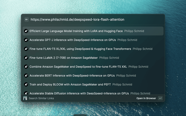 Open the Raycast window and trigger "Search Similar". Paste the URL link.