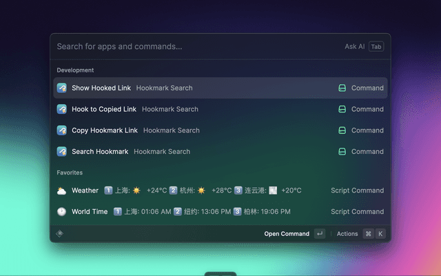 This Hookmark extension aims to provide a bookmarks search UI in Raycast. It is similar to the Free Alfred Workflows for Hookmark – Hookmark workflow in Alfred. You can retrieve all your Hook bookmarks in Raycast.