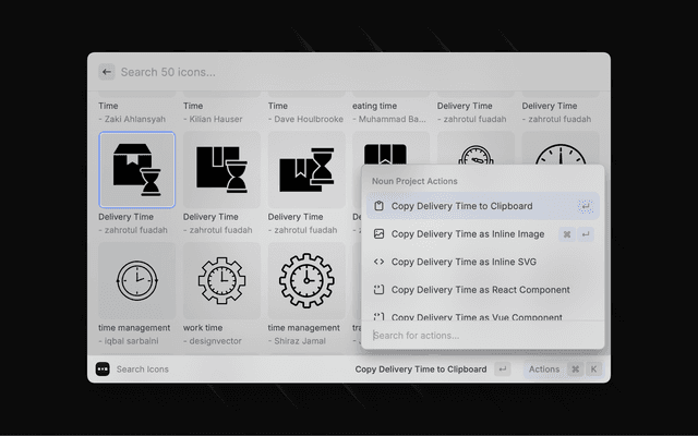 Search for and download SVG and PNG icons from the Noun Project. Copy icons to your clipboard and immediately paste them into apps like Miro, Pitch, Google Slides, and more. You can also copy the icons as HTML images, inline SVGs, and even React and Vue components.