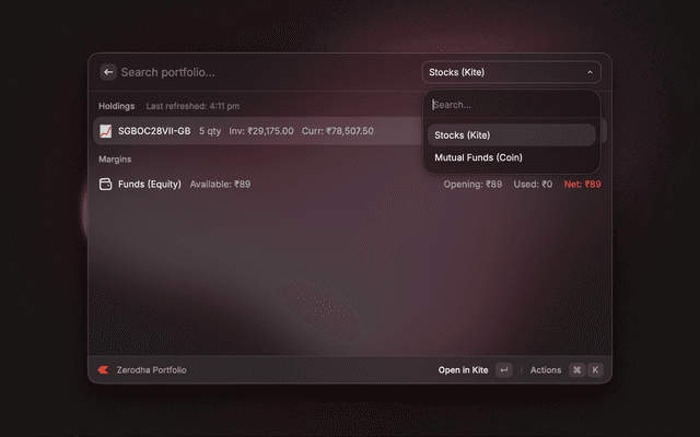 A Raycast extension to view your Zerodha portfolio — stocks from Kite and mutual funds from Coin — right from your launcher.