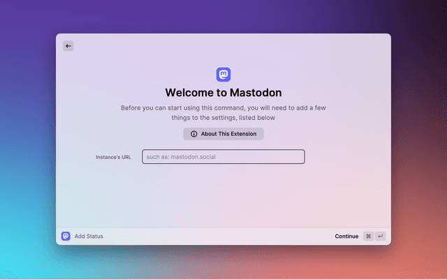 Input your Mastodon instance's URL, then click the "Continue" button in the bottom-right corner.