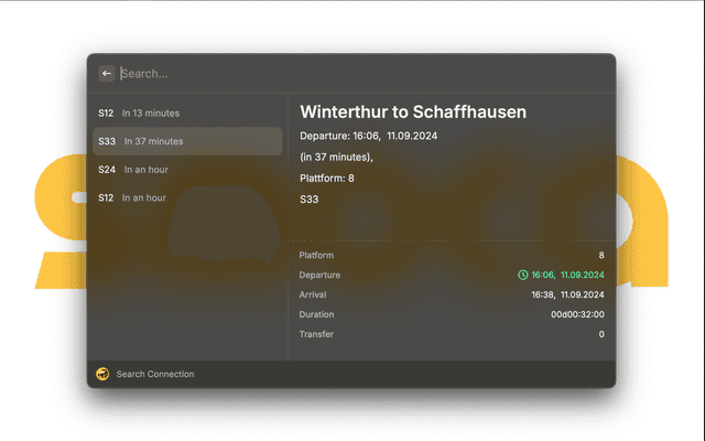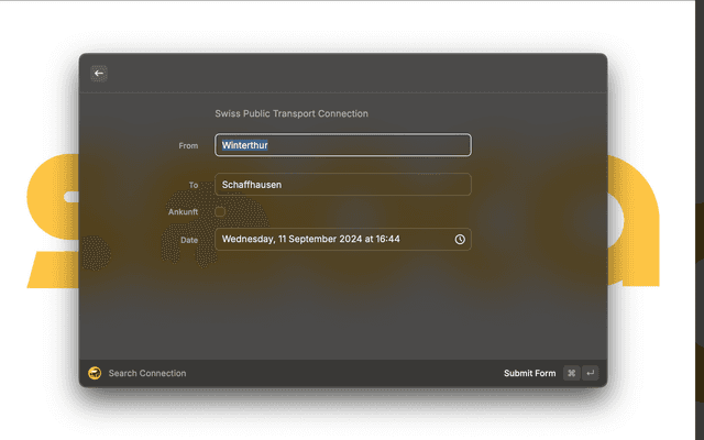This extension will connect to https://transport.opendata.ch/ to find swiss public transit connections
