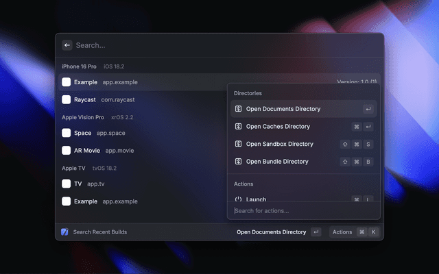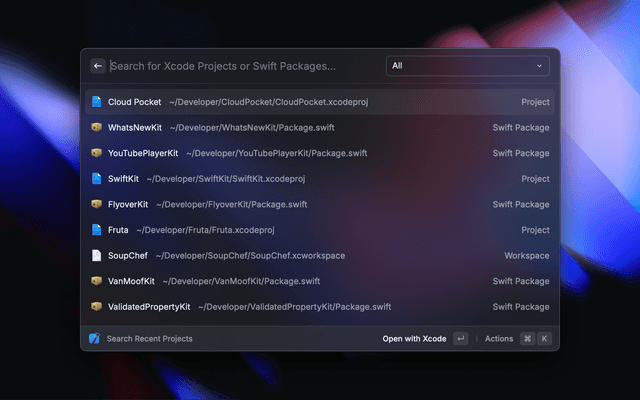Search and open your recent Xcode Projects, manage your Simulators & Apps, create Swift Packages & Playgrounds and quickly clear Xcode cache files.