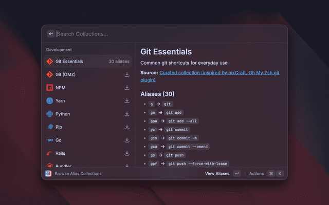 Cmd+N or click "Add New Alias"# Example: Add a quick git status alias