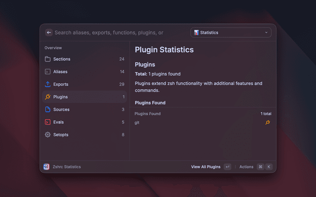 | 📊 | Statistics & Overview | Comprehensive statistics of your zshrc configuration with counts of aliases, exports, functions, plugins, and more |