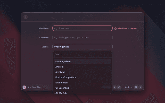| 🖥️ | Alias Management | Browse, add, edit, and search aliases organized by sections with full validation |