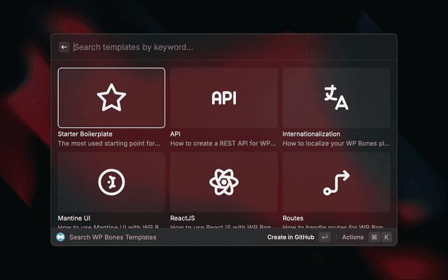 This mod provides several commands centered around managing the WP Bones WordPress plugin framework. It provides quite a few commands for varying uses, so there should be something for everyone! Take a look at the scenarios below to get a feel for how you might use the extension.
