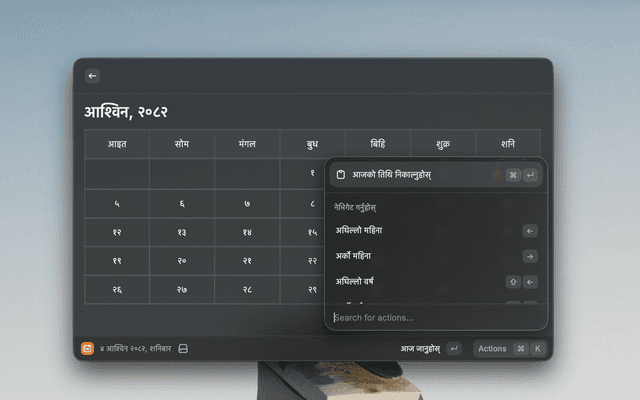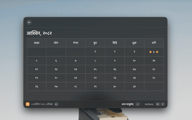 View the Nepali month calendar directly within Raycast. This extension allows you to quickly check dates, navigate through months and years, and view the calendar in either English or Nepali.