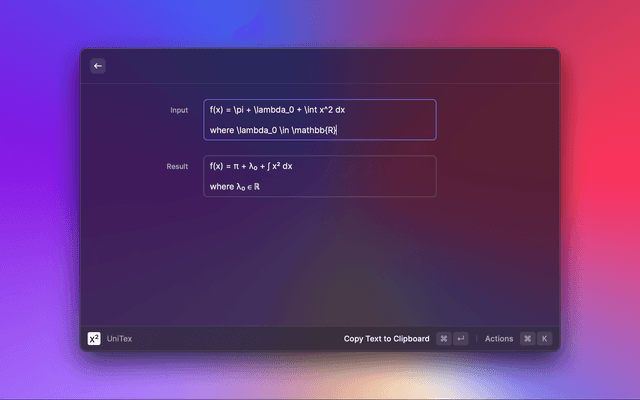 A Raycast extension to convert LaTeX math to unicode text using unicodeit.