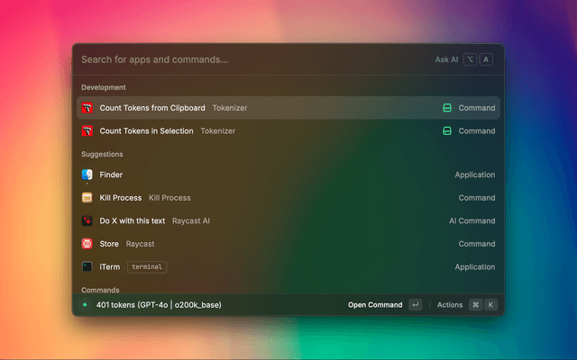 Quickly count tokens in selected text or clipboard content using popular AI model encodings.