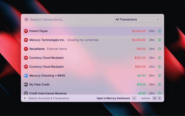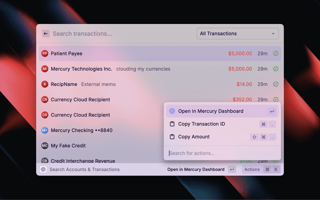 Quickly access your Mercury accounts and transactions directly from Raycast.