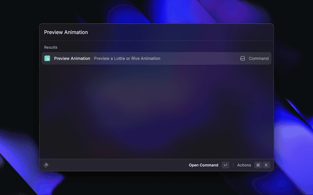 Motion Preview is a Raycast extension that allows you to quickly preview modern animation formats. It supports both Lottie (JSON and dotLottie) and Rive file formats.
