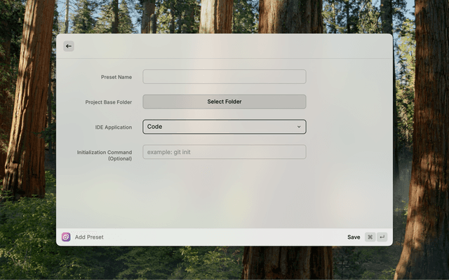 - Create Project Presets: Save your frequently used project folder locations, initialization commands and preferred IDE applications