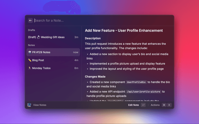 Create simple markdown notes in Raycast stored locally. No integrations required! Allows you to sync with a folder of your choice.
