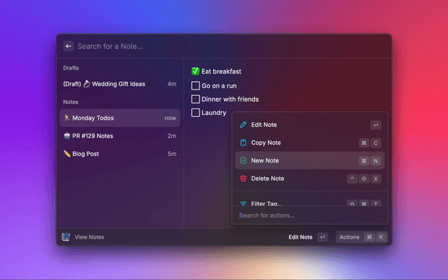 β + N - Create a new noteβ + β§ + C - Copy note body^ + β§ + X - Delete a noteβ + T - Quick apply / remove tagβ + β§ + T - Create a new tagβ + F - Filter by tag^ + β§ + T - Delete tagsβ + M - Toggle note metadataβ + S - Sort notesβ + I - Summarize note with AIβ + β§ + I - Clear AI summaryCreate Note