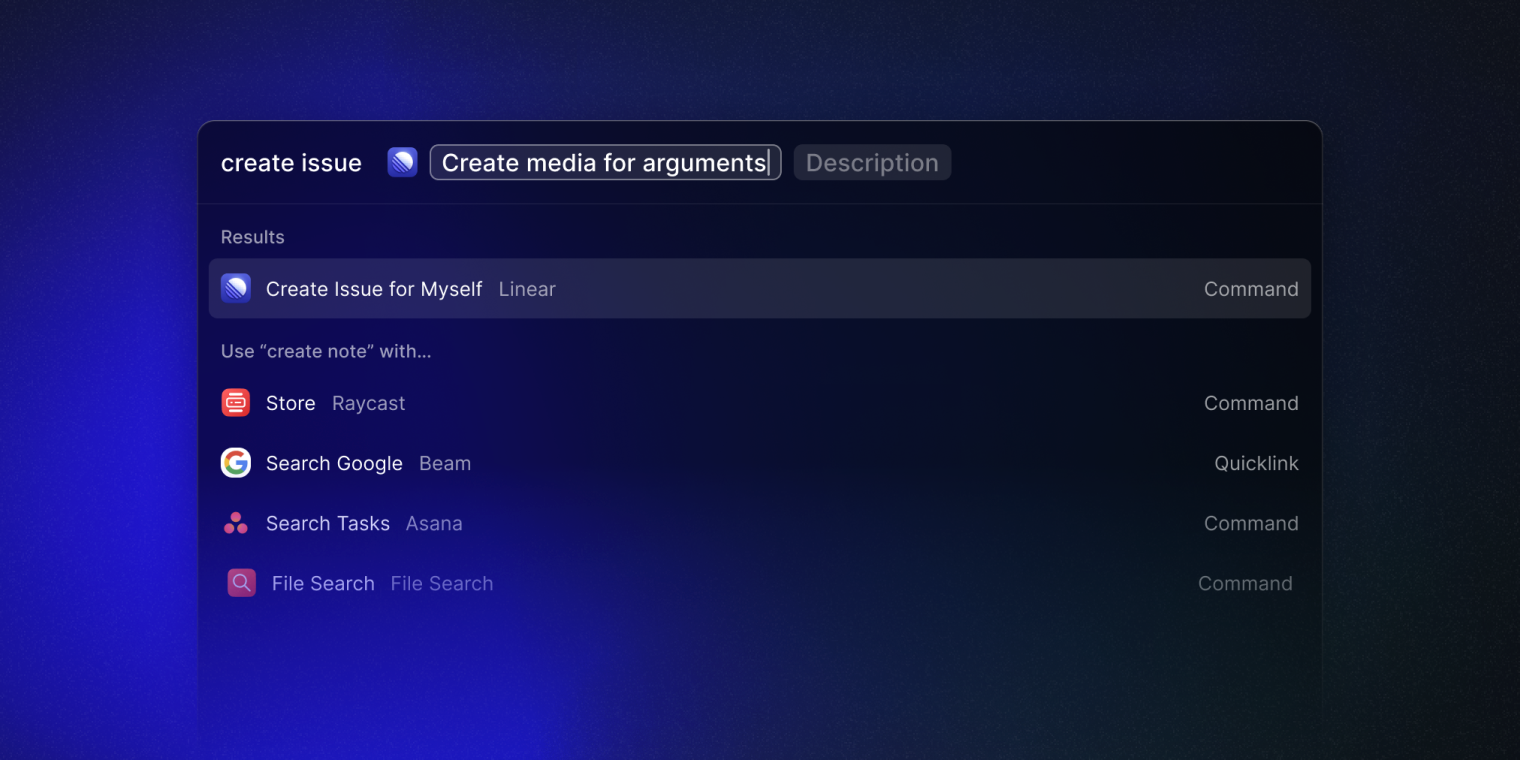 The long-awaited demand for arguments from Script Commands also went live on Thursday, now available in a command. So you can now create a Command and include up to three queries to search for information on your common websites or create an issue simply in Linear.