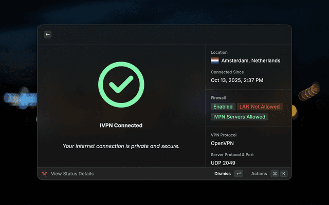This extension allows you to quickly interact with your IVPN account, minimizing context-switching.