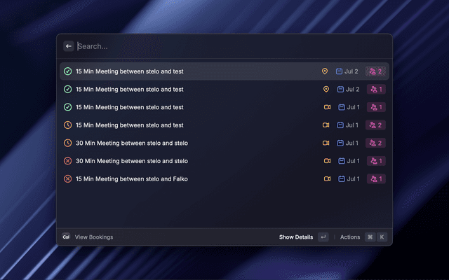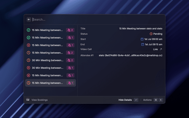 Quickly share your Cal.com meeting links, generate private links, view and cancel bookings.