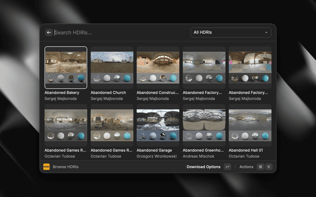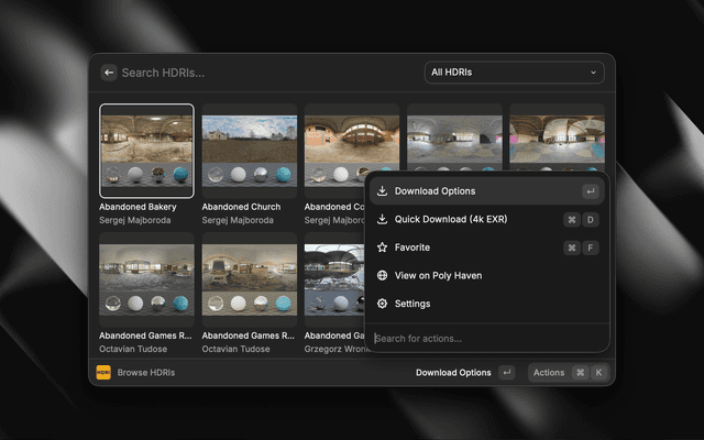 - Browse HDRIs: Search and browse the complete Poly Haven HDRI library with beautiful thumbnail previews