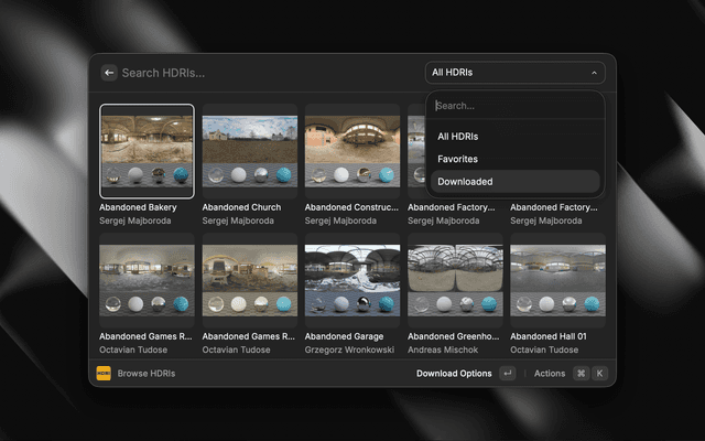 - Use the filter dropdown to view All HDRIs, Favorites, or Downloaded items