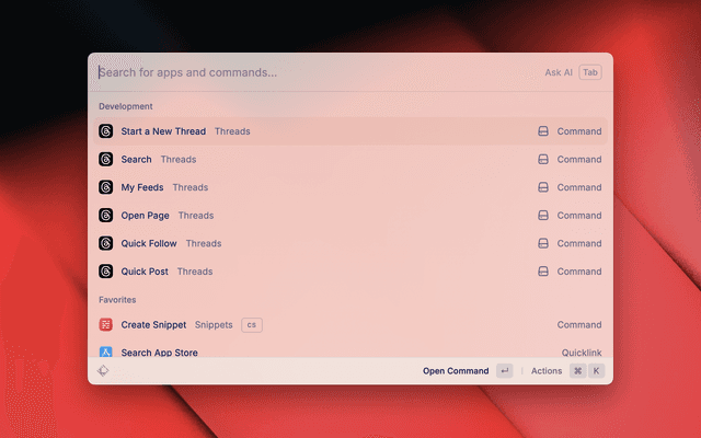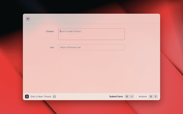 A basic extension for quickly navigating Threads. Post updates, follow users, view profiles, and browse topics directly from Raycast.