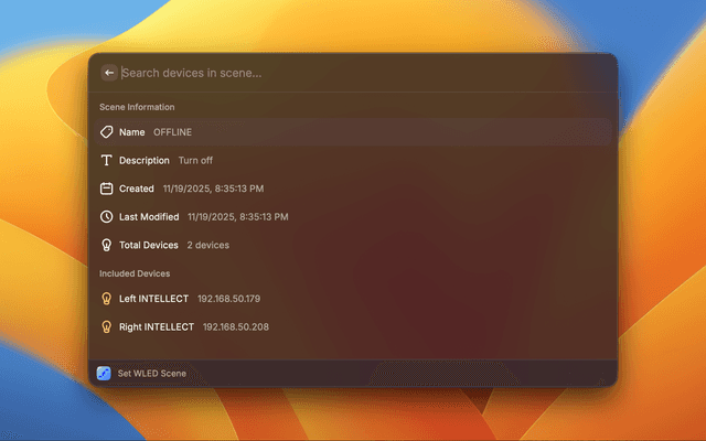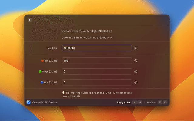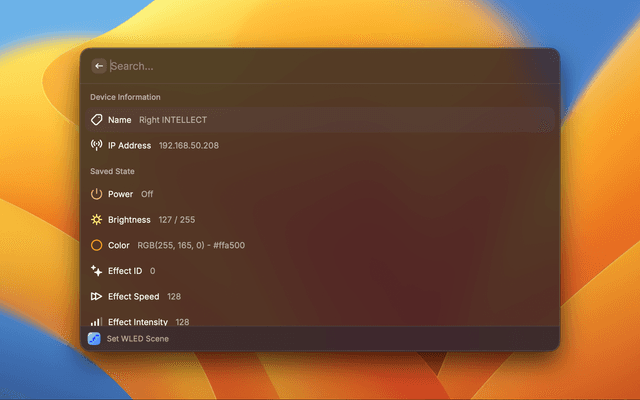 Control your WLED LED strip devices directly from Raycast. Manage multiple devices, adjust colors, brightness, and apply effects with a simple, unified interface.