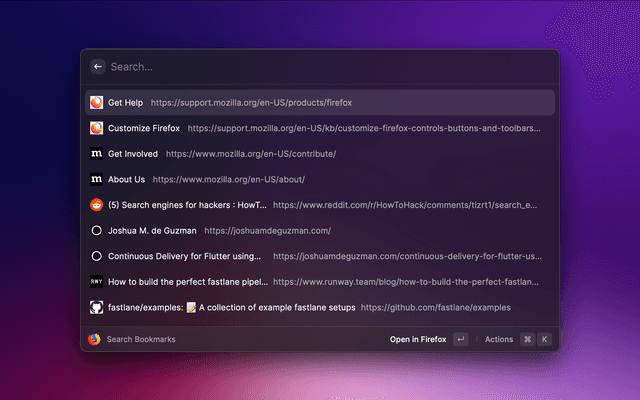Search and open Mozilla Firefox tabs from search query, opened tabs, bookmarks and history.