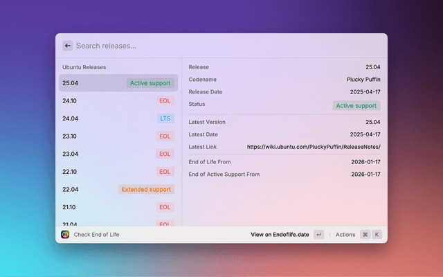 An extension to bring endoflife.date into Raycast. Get End-of-life (EOL) and support information for various products, services and frameworks.