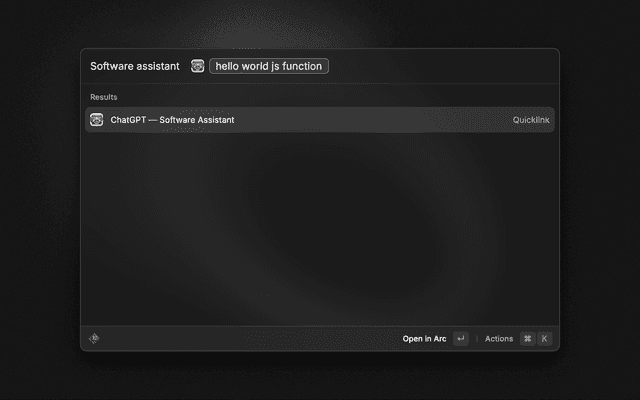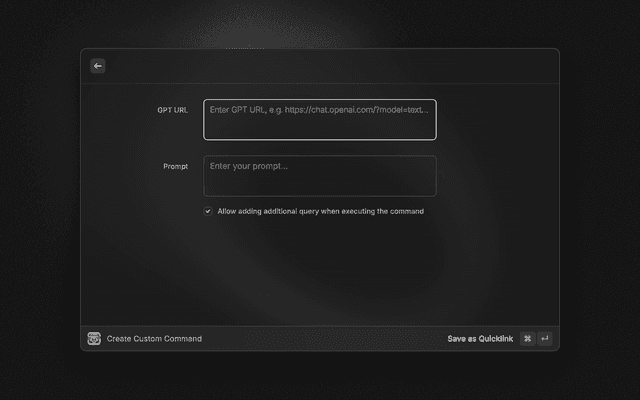 Open ChatGPT in the browser from raycast with your custom prompt and specific query. The extension leverages AppleScript to open a URL and execute JavaScript within a browser tab, automating the process of inserting your prompt and query, and then pressing the submit button. You can create multiple custom commands to open specific GPT versions or to open existing chats, using your custom prompt and an additional query that you provide on the fly while running the command.