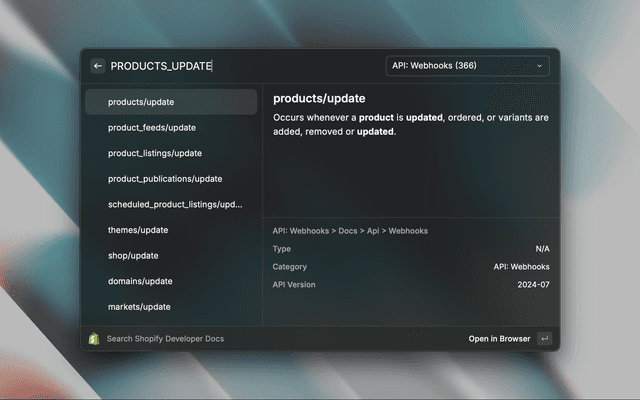 This Raycast extension searches through the Shopify developer documentation at https://shopify.dev/docs/ and lets you open up the result in your browser. Useful for quickly looking up GraphQL mutations and object types.
