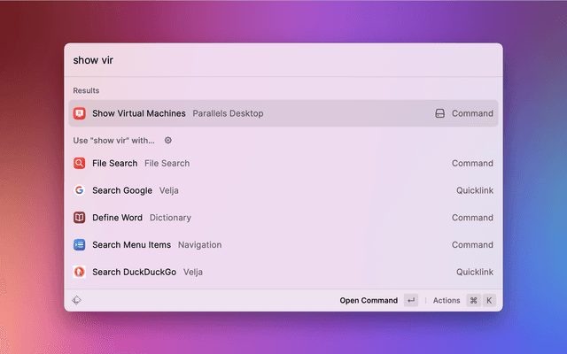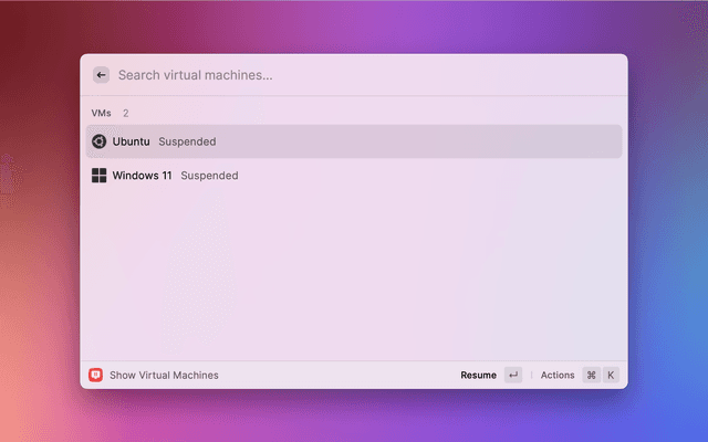 List virtual machines in Parallels Desktop. Open, start, resume, and suspend virtual machines.