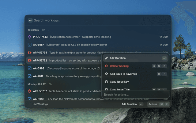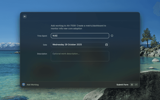 - Add Worklog: Quickly log work hours to any issue with flexible duration formats (1h, 1h30m, 2h)