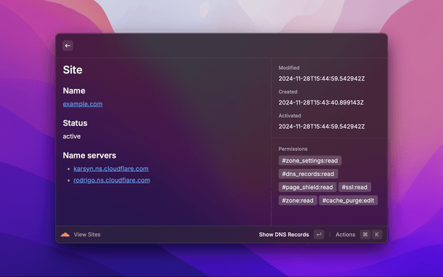 This extension allows to view your Cloudflare sites, pages, domains, and more. It also supports purging the cache of your sites.
