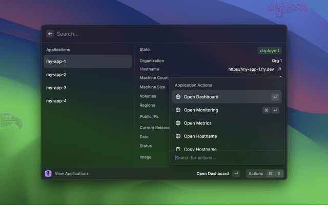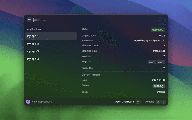 This extension allows you to list all the Fly.io applications you have access to, view their details and do a number of keyboard only operations, such as: