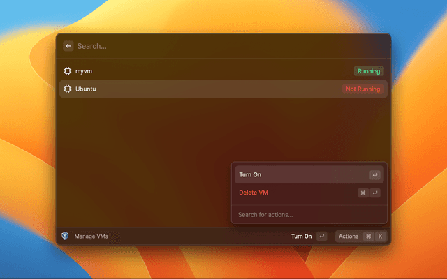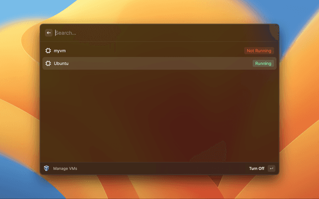 List your VirtualBox VMs, turn them on/off, or delete them.