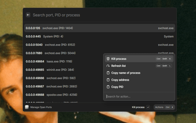 - Kill Process: Select a port and use the keyboard shortcut or "Kill Process" action