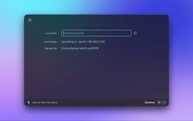 - Open Raycast and search for "Upload Files via Rsync"