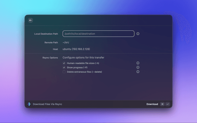- Open Raycast and search for "Download Files via Rsync"