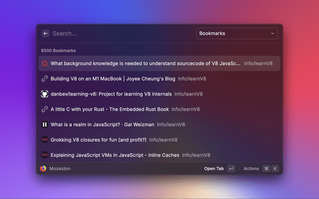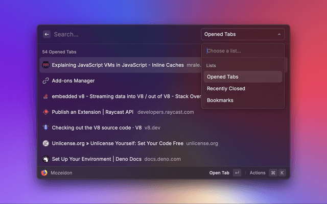Search and open Mozilla Firefox tabs from search query, opened tabs, recently-closed tabs, and bookmarks.
