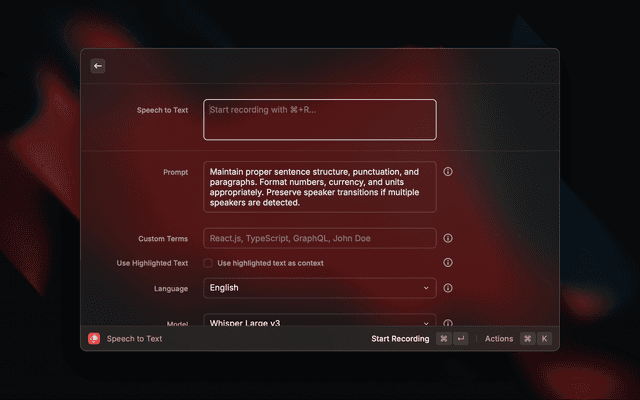 - Open Raycast and search for "Speech to Text"