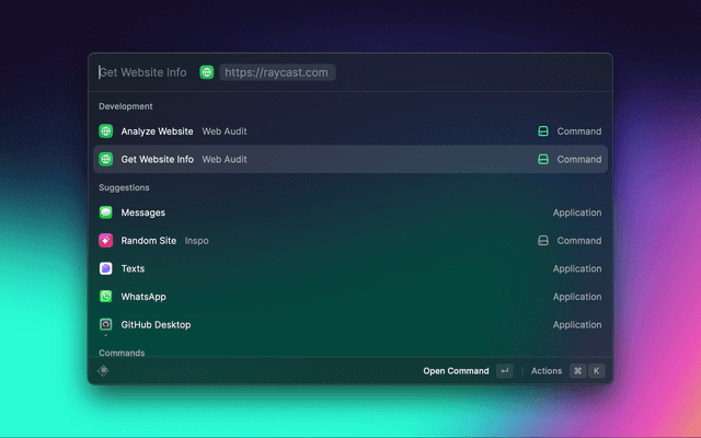The command for starting the Extension is Analyze Website [https://raycast.com/]. You can use any URL you want, if it is not reachable or you don't type the URL in including a protocol, the extension will throw an error. You can press ⌘T to see some more information on how to fix the issues.