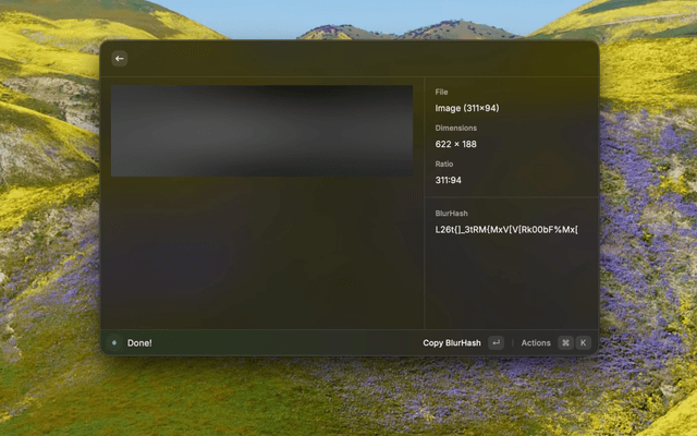 - Shows a decoded blurhash preview alongside file metadata