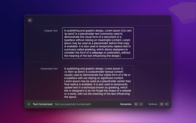 This Raycast extension allows you to easily humanize text using an AI-powered service. Simply paste your original text, click the "Humanize" button, and the humanized result will be displayed. You can then copy the humanized text to the clipboard with a single shortcut.